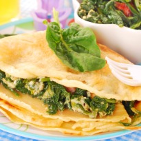 To make the crepes, place the herbs and oil in a food processor and blend until smooth.Add the milk, eggs, flour, and salt and process again. Leave to rest for 30 minutes. Heat a small frying pan and add a little oil.
